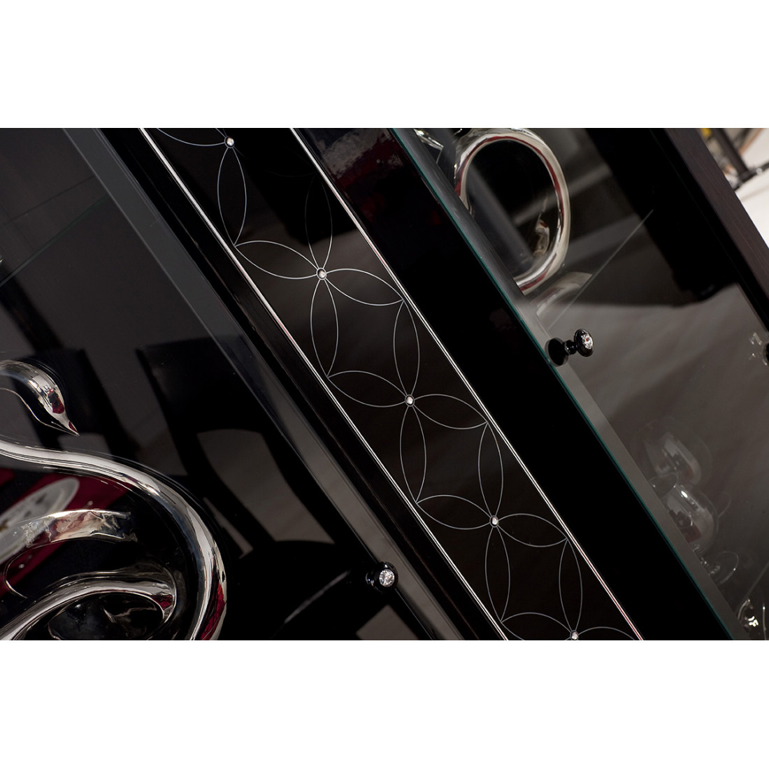 Двухстворчатый шкаф-витрина в гостиную MIRA-01 (венге) серии Мира от Беллона выполнен в ультрамодном стиле модерн, сочетающим в себе гармоничную симметричность классики и лаконичность минимализма. Купить стильную модель витрины (серванта) для обстановки гостиной, кабинета стоит и за добротное исполнение: практичная конструкция сопровождается использованием для полок, фасадной части каленого стекла, абсолютно безопасного при случайном разбитии.