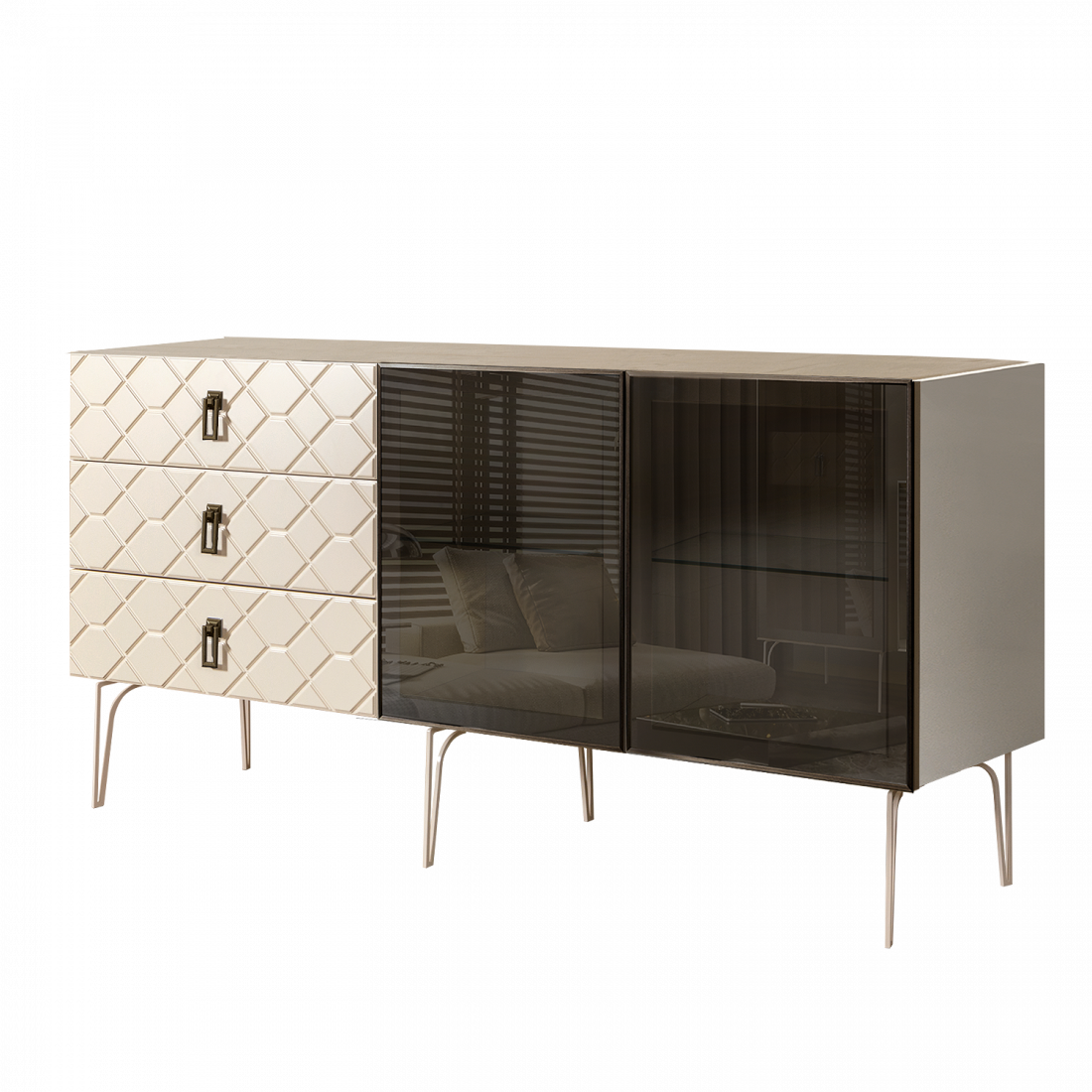 Стекло Stopsol меняет свои отражающие свойства под воздействием источников света. Поверхность, отражающая свет, мягко скроет содержимое вашего комода или витрины.