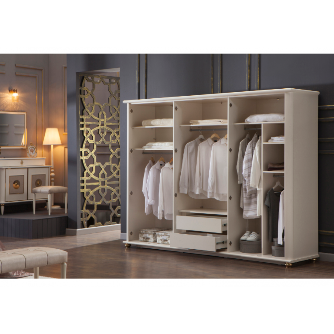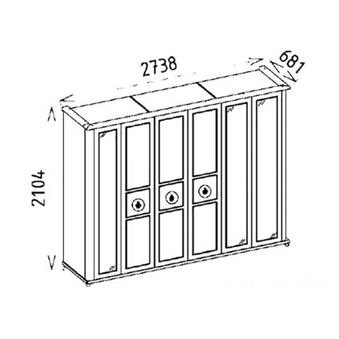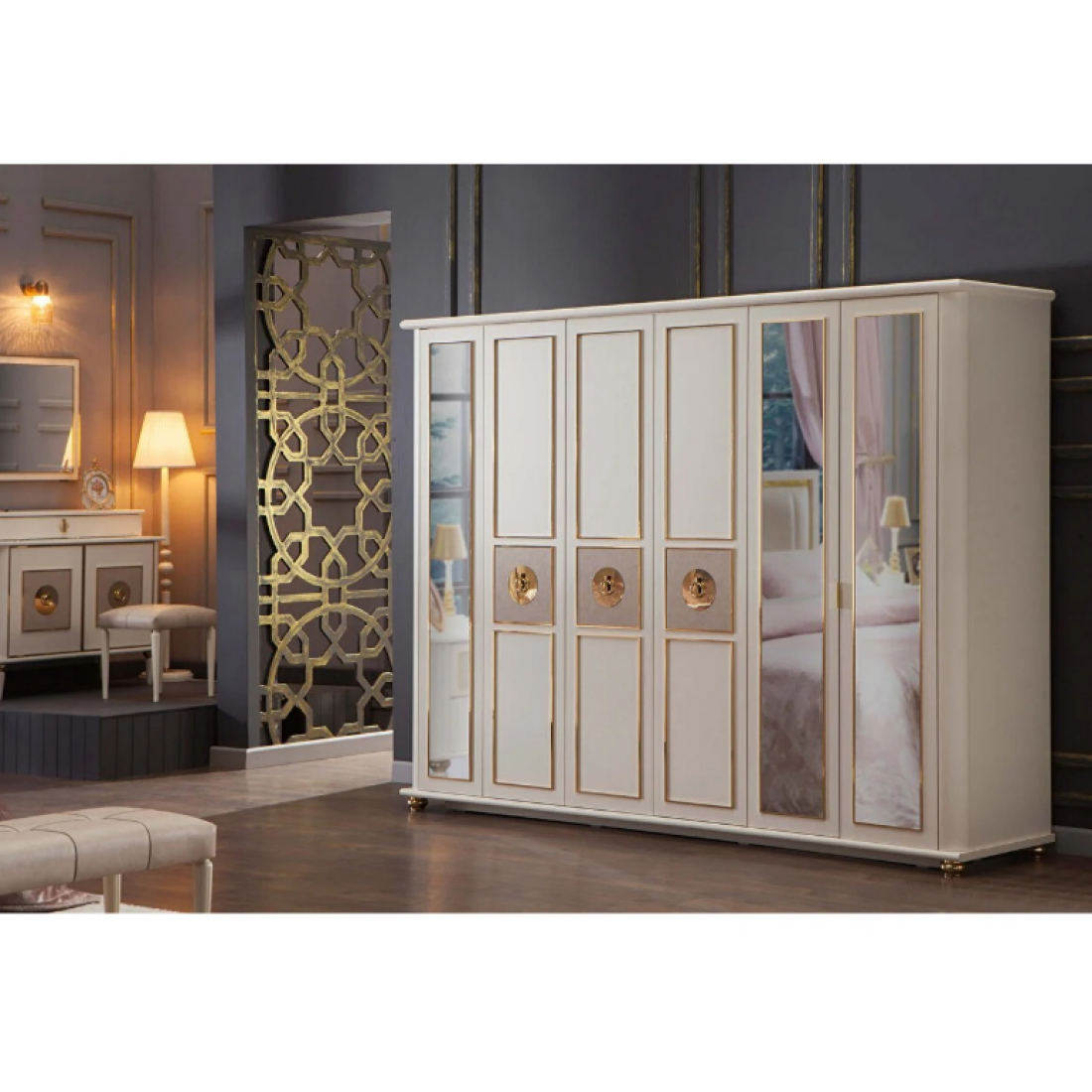 Шести-дверный платяной шкаф Mistral от Bellona. Три зеркальные двери по краям, и три двери с золотой отделкой, металлическими ручками в виде петли в центре. Шкаф вместительный, по высоте подходит для большинства помещений, глубина 68 см - позволит удобно разместить вешалки с одеждой. Двери с доводчиками, обеспечивающими плавный ход и безопасность. Шкаф изготовлен из высококачественного ЛДСП производства Турция, класс эмиссии формальдегидов Е1.
