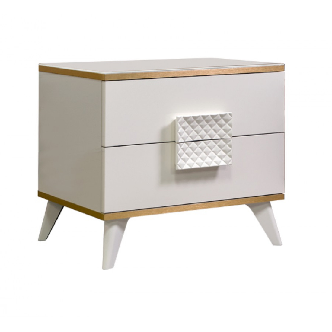 Великолепно вписались в концепцию спальни «Diora» поверхность комодов и тумбочек  выполненная из стекла в соответствии с цветами корпуса. Это решение позволяет чаще делать влажную уборку и не боятся, что мебель испортится.