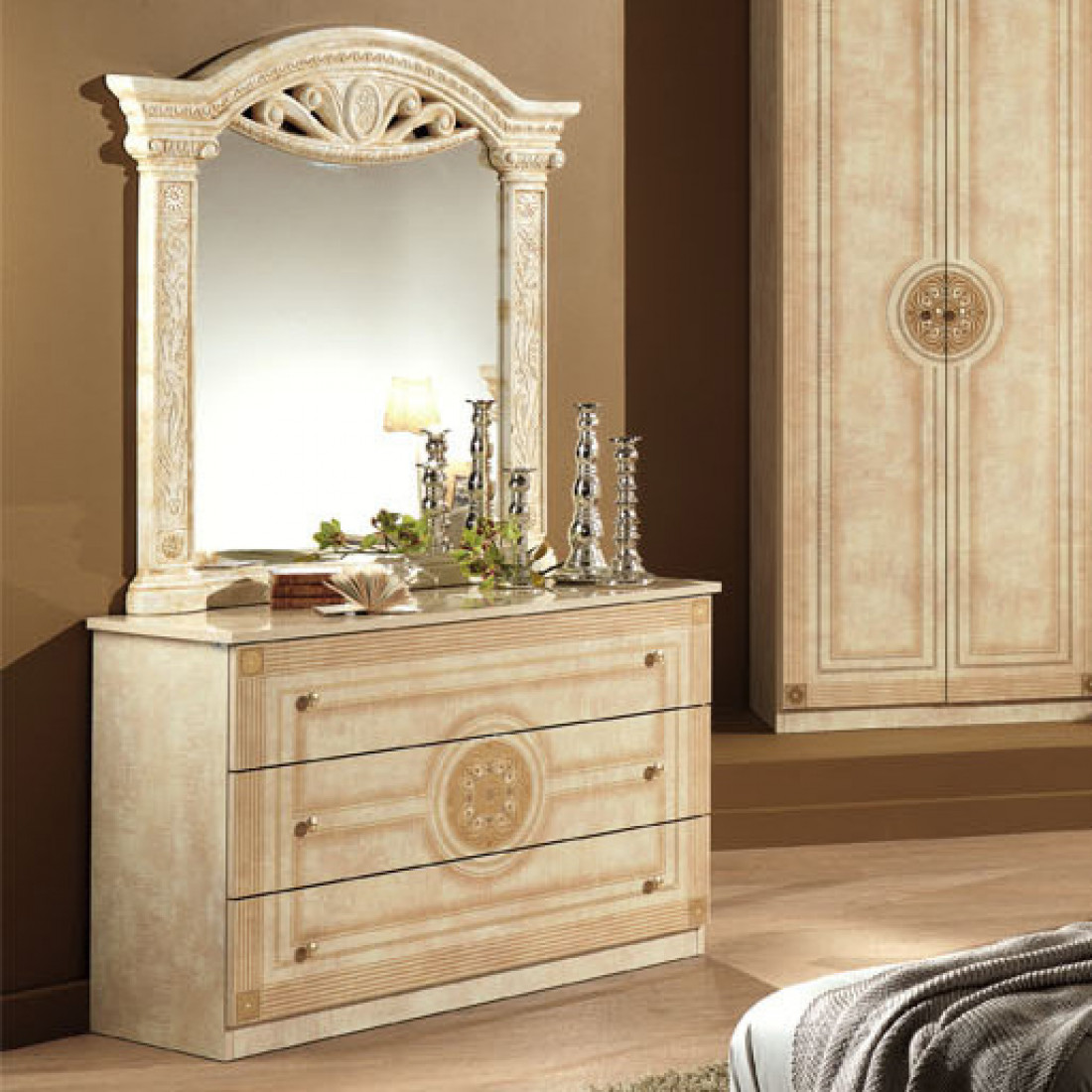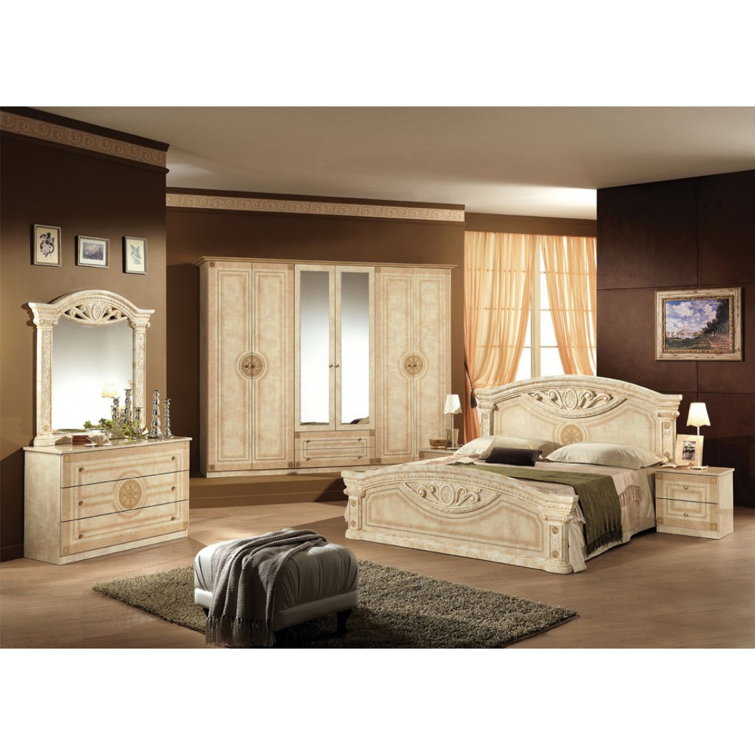 Спальня Рома (беж) композиция 2 от Российской фабрики «ДИА мебель» выполнена в строгом, классическом стиле. Бежевый цвет в сочетании с глянцевым покрытием придает элегантность. Такая спальня поможет Вам окунуться в атмосферу роскоши и комфорта. Большой шестистворчатый шкаф поможет с пользой заполнить место. Безшумные и плавно закрывающиеся дверцы шкафа и комода помогут с легкостью забыть о шуме по утрам. Вся коллекция "Рома" предназначена только для истинных ценителей элегантного классического стиля.