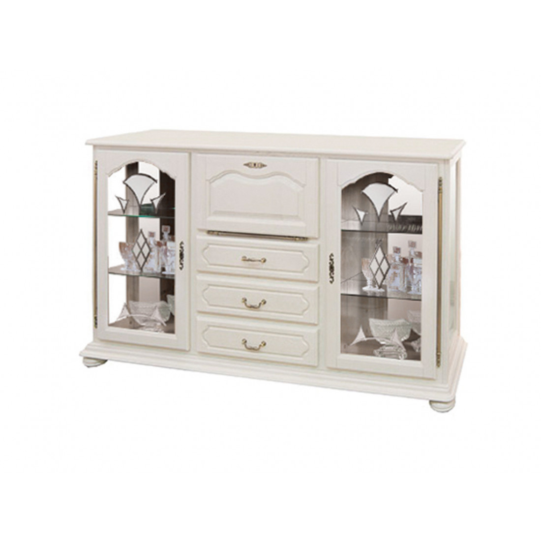 Большая тумба-бар из набора мебели "Давиль", пожалуй, самая оригинальная модель коллекции. Это высокая тумба с боковыми стеклянными витринами, тремя выдвижными и одним откидным ящиками по центру. При необходимости откидной ящик может использоваться в качестве столешницы. Фасад выполнен из массива дуба. Модель окрашена в оттенок "Белая эмаль".