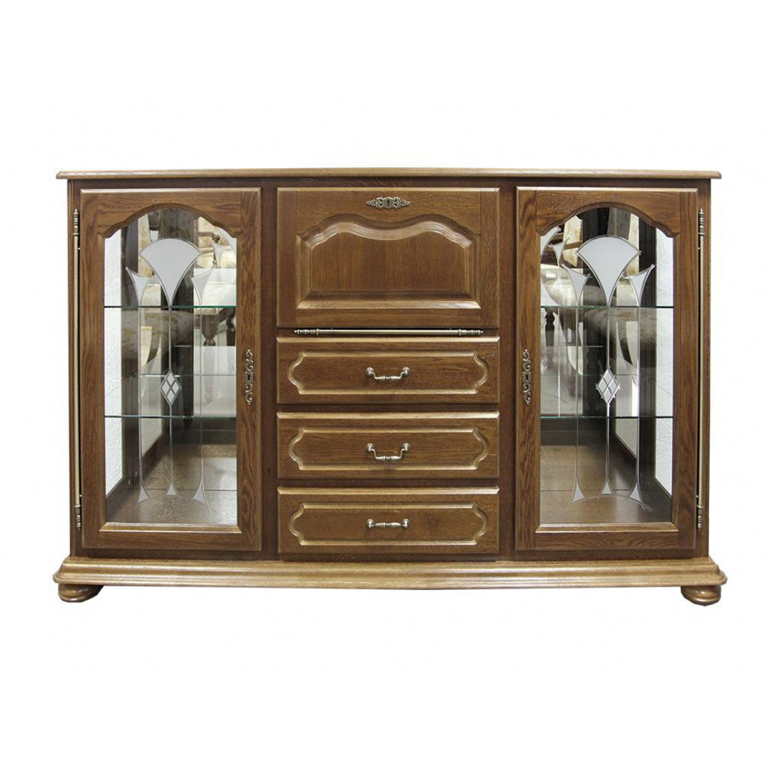 Большая тумба-бар из набора мебели "Давиль", пожалуй, самая оригинальная модель коллекции. Это высокая тумба с боковыми стеклянными витринами, тремя выдвижными и одним откидным ящиками по центру. При необходимости откидной ящик может использоваться в качестве столешницы. Фасад выполнен из массива дуба. Модель окрашена в оттенок "Медовый дуб с золотой патиной".