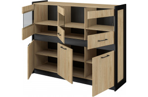 Сдержанный характер металлической ручки матового цвета дополняет общую стилистику коллекции Стенли и имеет приятные тактильные ощущения. Кромка фасадов и столешницы выполнена в технологии софт, благодаря чему достигается эффект утолщённого фасада, приближённый к отделки деревянных элементов. Модули, содержащие витрину продуманы таким образом, чтобы вы могли легко разместить свои любимые аксессуары, они не будут спрятаны за фасадом. Задняя стенка в модулях чёрного цвета, что так же подчёркивает контраст и глубину.